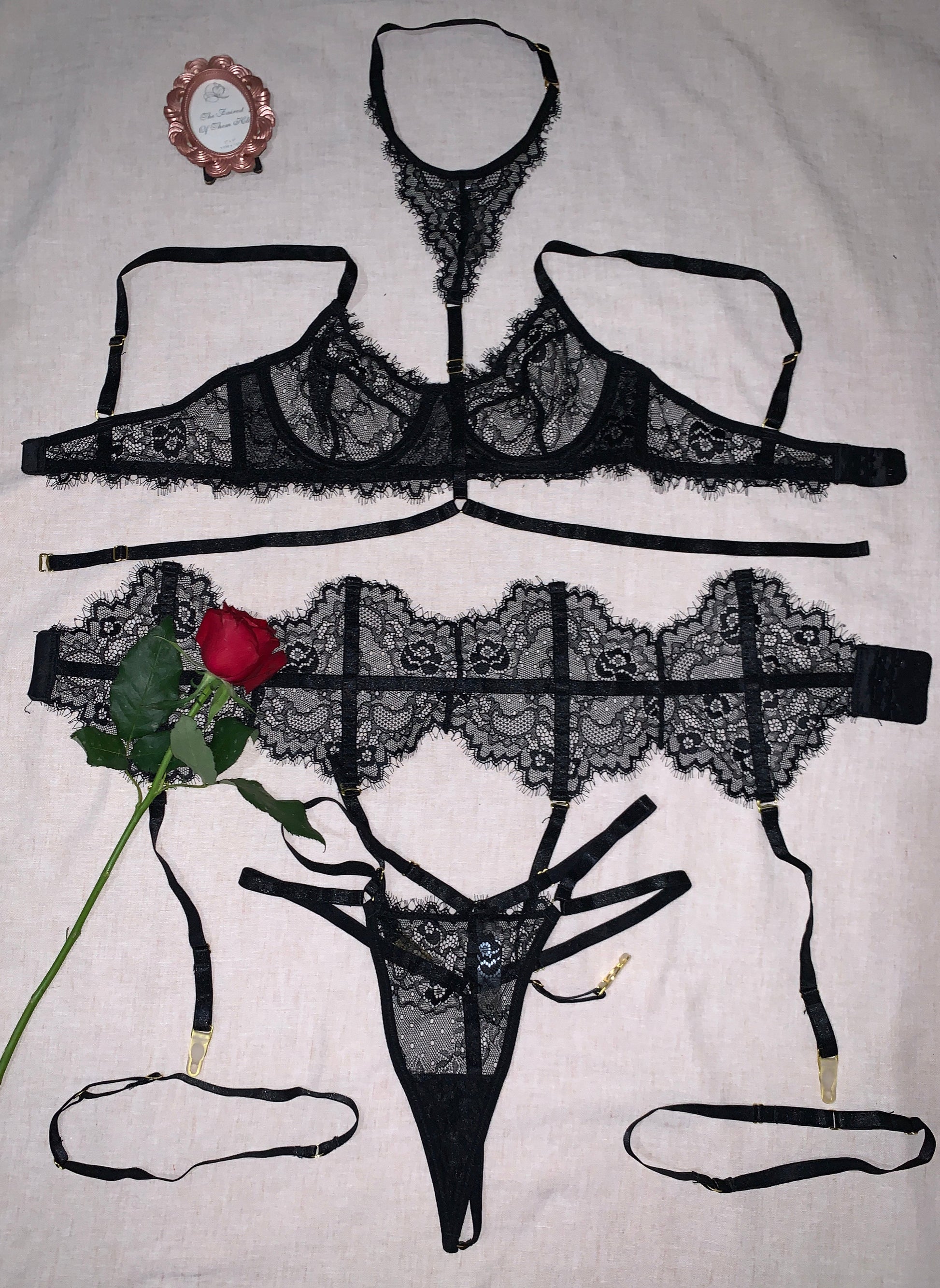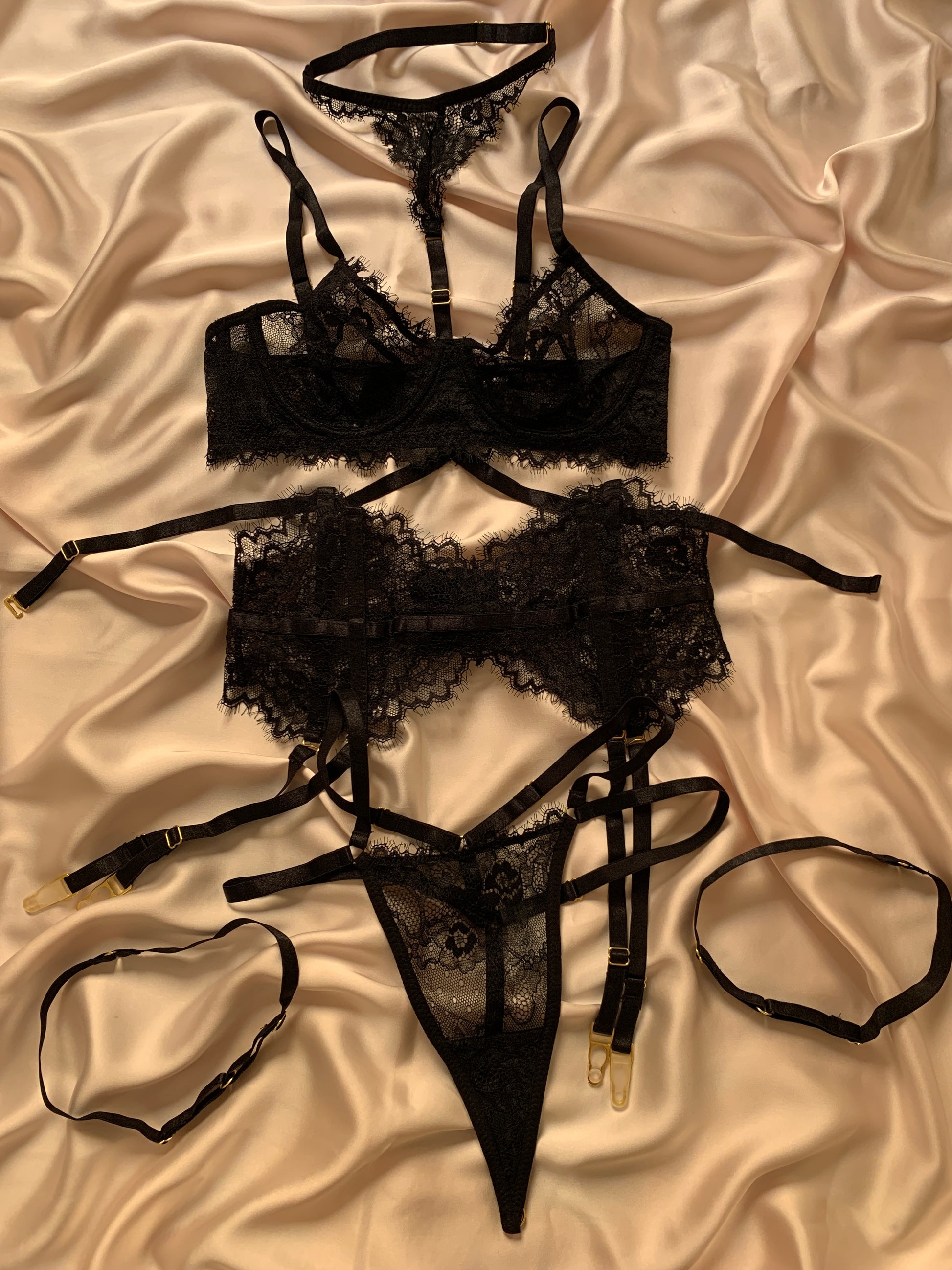 Step into mystery with Layla Set, a seductive black lace lingerie ensemble that combines sensuality with elegance.